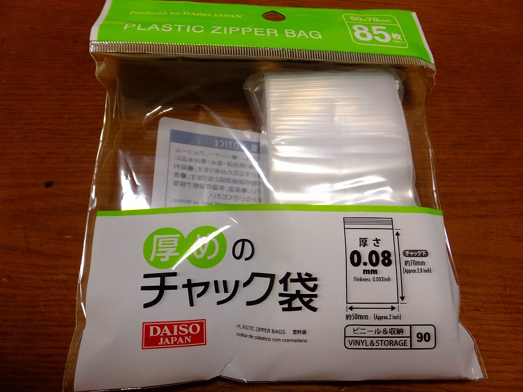 集めのチャック袋。メダルの横幅にマッチするのが幅50mm、高さ70mmのこの袋です。