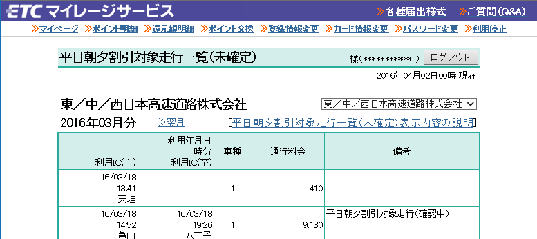 ※ETCマイレージサービス(http://www.smile-etc.jp) に申し込んでいなければ適用されないのでご注意を。