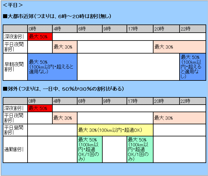 割引適用時間 平日の朝6〜9時と夕方17〜20時に料金所を通過すれば良い。