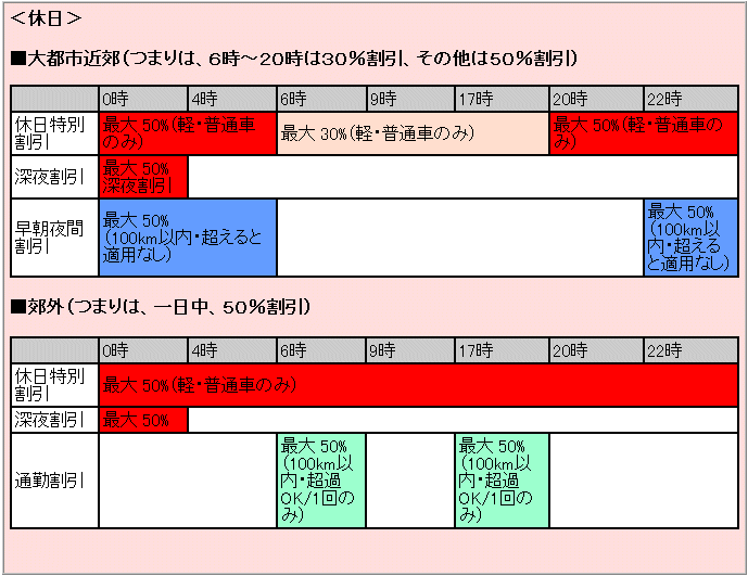 A休日割引・・・約30%割引、地方部区間のみ、軽自動車または普通車のみ