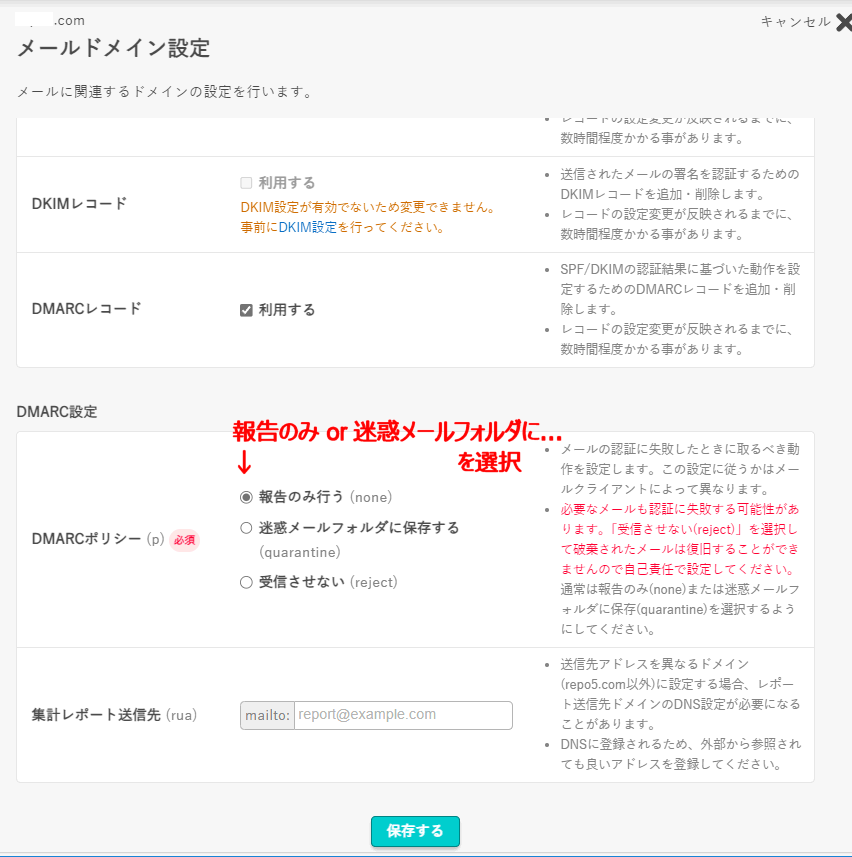 DMARC設定もとりあえず「◎報告のみ行う」をチェックしておけば良いでしょう。