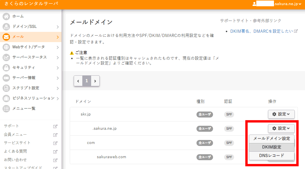 設定対象のドメインで「設定▼」を選択する表示されるメニューで「DKIM設定」を押します。
