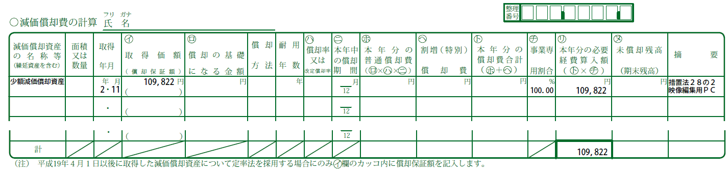 少額減価償却資産 として、取得金額等の記載が必要です。また摘要欄には「措置法28の2 "備品名" 」の記載が必要です。